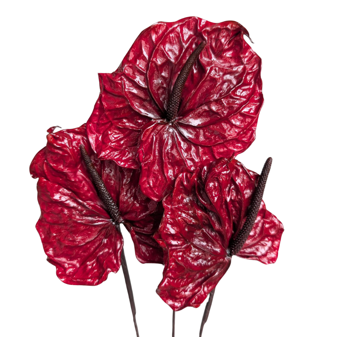 Preserved Anthurium includes 3 stems, approx. 40cm in length, in a rich Wine Red shade. Each flower measures approximately 10cm and features a wired base for seamless placement in floral designs. This preserved tropical flower is ideal for DIY floral arrangements, craft compositions, and home styling projects, offering a bold sculptural form and smooth texture that enhances both minimalist and mixed-material designs.