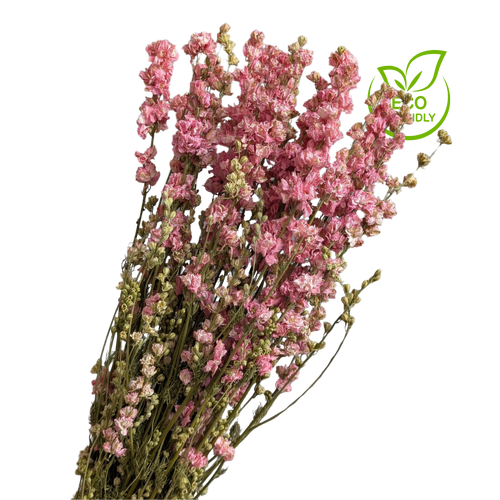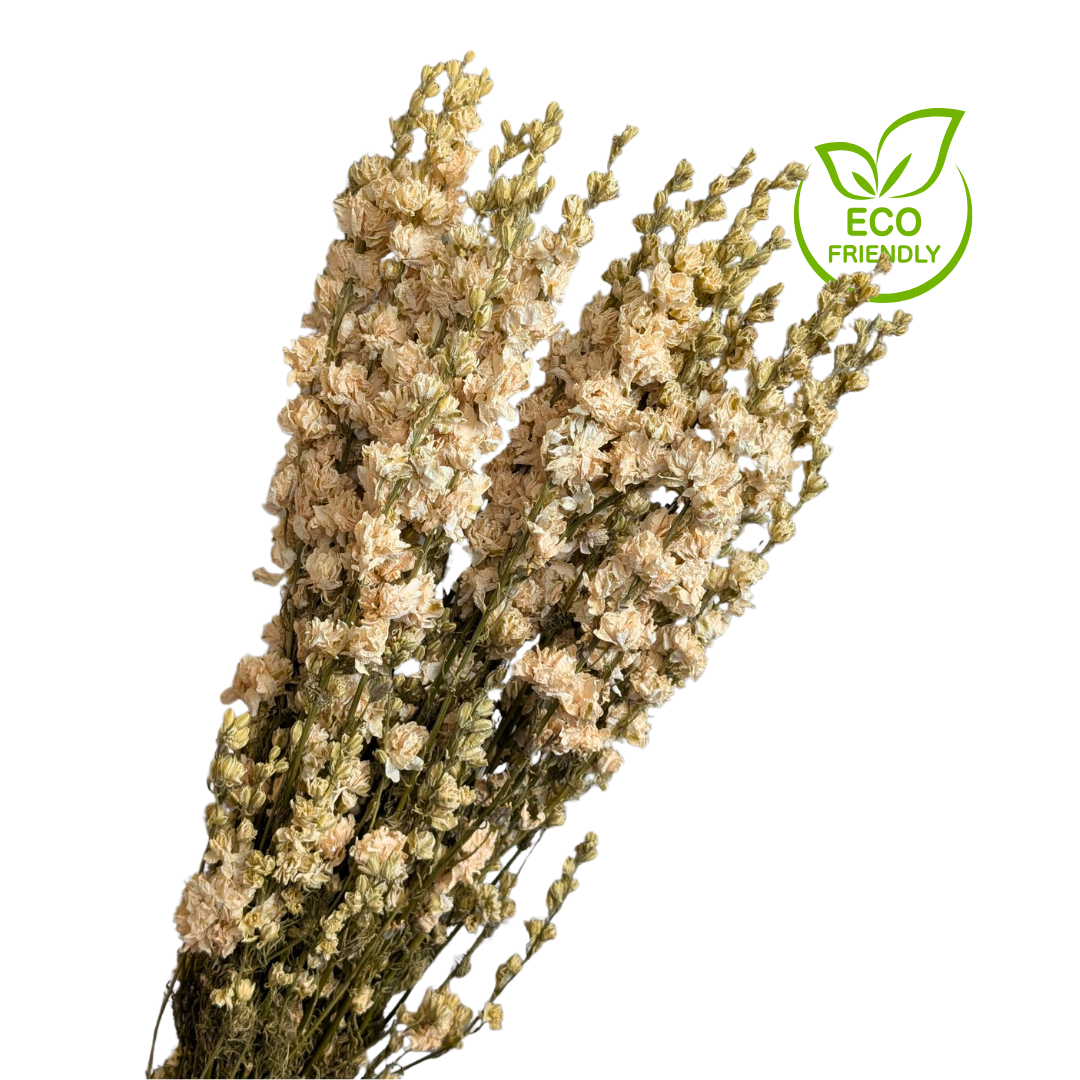 Add vertical elegance to your floral styling with Natural Whte Dried Delphinium, featuring tall spires of delicate blooms that bring height, softness, and colour to any arrangement. With stems measuring approximately 70cm, this variety is ideal for bouquets, ceremony backdrops, and retail displays that require structure and drama. Its naturally dried finish offers a zero waste, low-maintenance alternative to fresh florals—perfect for event prep, DIY styling, and home décor.