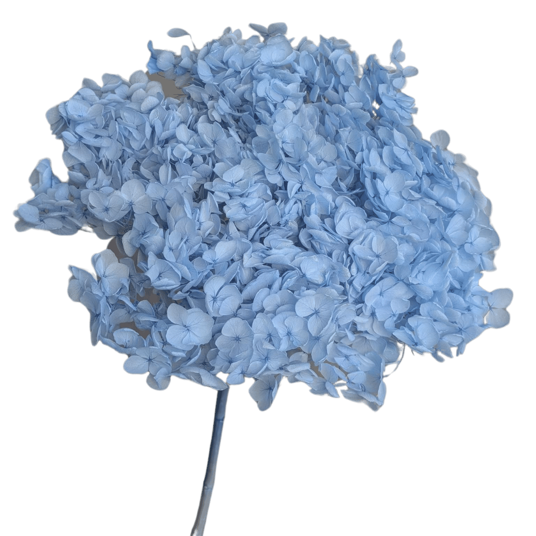 Preserved Hydrangea includes 1–2 stems, approx. 40cm in length, with bloom diameters ranging from 18–23cm, in a soft Blue tone. Multi-petal clusters offer gentle volume and airy texture, making them ideal for bouquets, event styling, gift boxes, and 360° dried designs.