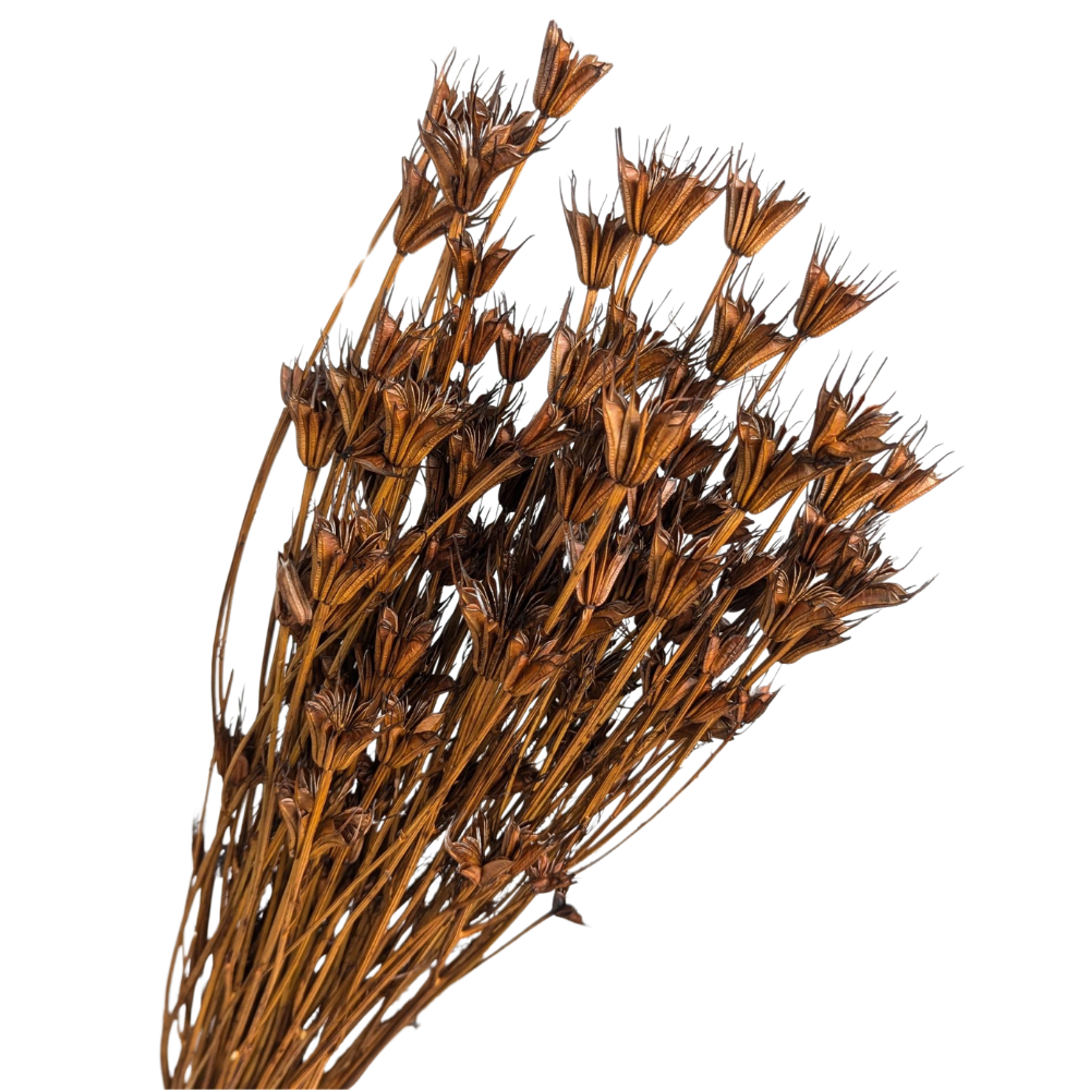 Preserved Nigella Orientalis includes 20 stems, approx. 50cm in length, in a soft brown tone. Each stem features a sculptural, open-faced pod with fine bracts and a lightly textured finish—ideal for bouquets, wreaths, DIY kits, and seasonal styling.