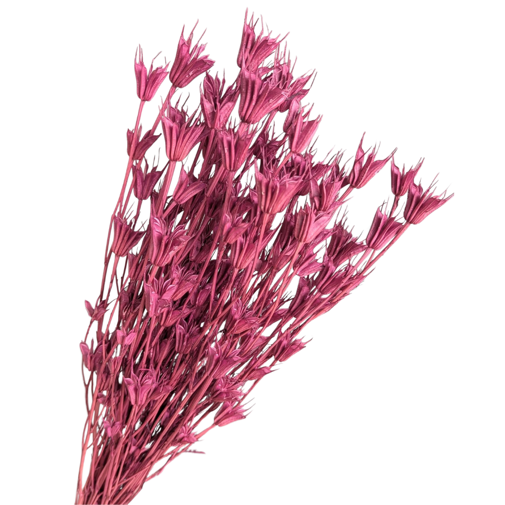 Preserved Nigella Orientalis includes 20 stems, approx. 50cm in length, in an elegant raspberry tone. Each stem features a sculptural, open-faced pod with fine bracts and a lightly textured finish—ideal for bouquets, wreaths, DIY kits, and seasonal styling.