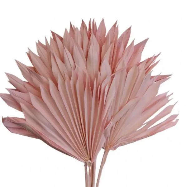 Dried Palm Suns include 6 stems, approx. 60cm in length, in a soft Pink tone. Each frond is shaped into a bold, sunburst silhouette with layered texture and fan-like symmetry—ideal for boho backdrops, event styling, bouquets, and DIY installations.
