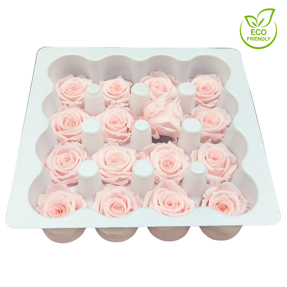 This pack contains 16 preserved spray rose blooms in a soft pink champagne tone, each measuring approximately 23–27mm in diameter and height. Their petite size and blush-toned elegance make them perfect for DIY floral and craft design, formal corsages and buttonholes, and wedding floral styling.