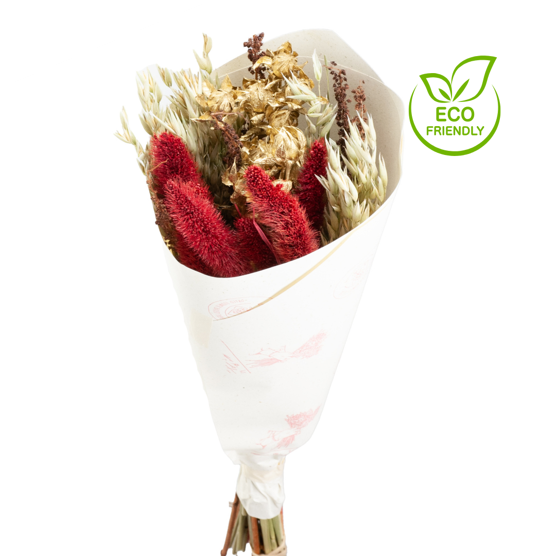 This ready-to-go bunch features a vibrant mix of red, gold, green, and natural tones, with stems measuring approximately 50cm. Designed for gifting, home décor, and DIY floral and craft design, it includes a curated blend of dried botanicals: