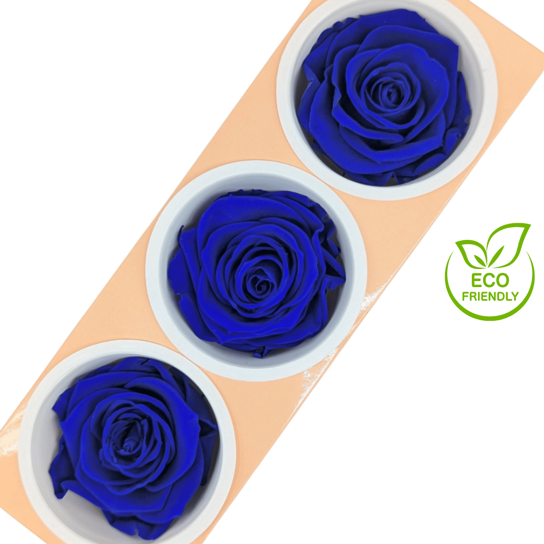 Designed for weddings, formals, cake décor, and DIY floral and craft design, these preserved roses feature rich sapphire blue blooms with a diameter of approximately 6cm and a height of 5–6cm. Each pack contains 3 blooms, each with a short stem: 0.5cm, making them suitable for wiring or to attach to preserved stems.